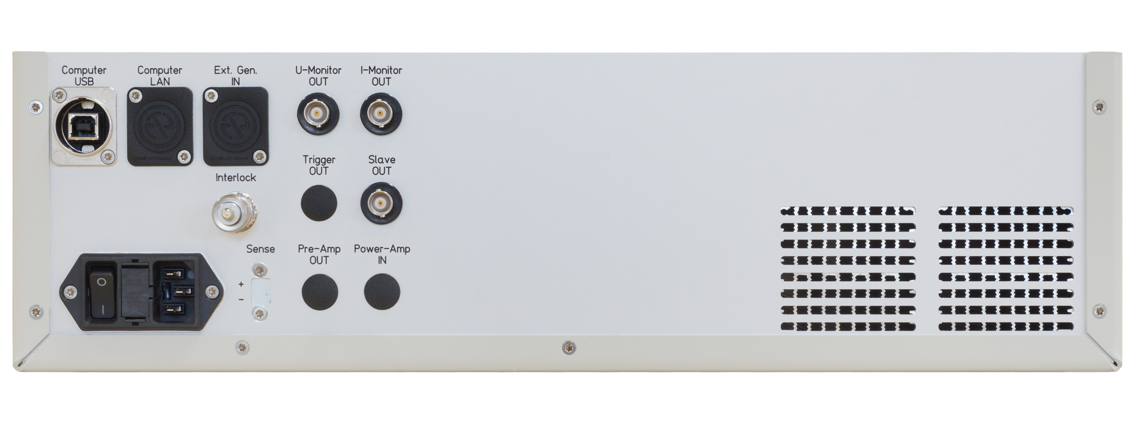 Par ailleurs, l’amplificateur peut être complètement contrôlé à distance au moyen d’un simple protocole d’octets via l’interface USB ou LAN. Si des tensions de sortie ou des courants de sortie plus élevés sont nécessaires, les configurations avec plusieurs dispositifs A1110-05-E connectés en série ou en parallèle sont possibles.