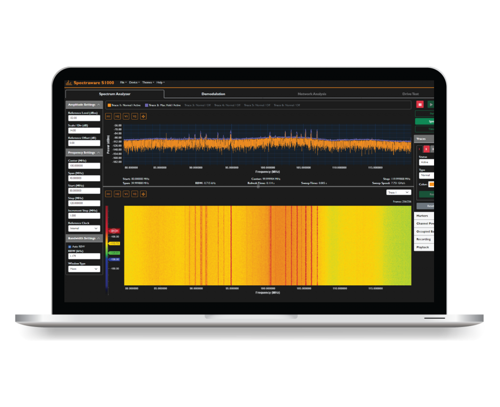 Conçu pour la surveillance du spectre et le déploiement d’applications, l’analyseur de spectre en temps réel thinkRF R5550 offre des performances spectrales optimisées dans un format léger, sans ventilateur et portable, tout en permettant une analyse approfondie des formes d’onde complexes et à large bande, même dans des environnements spectraux difficiles.
